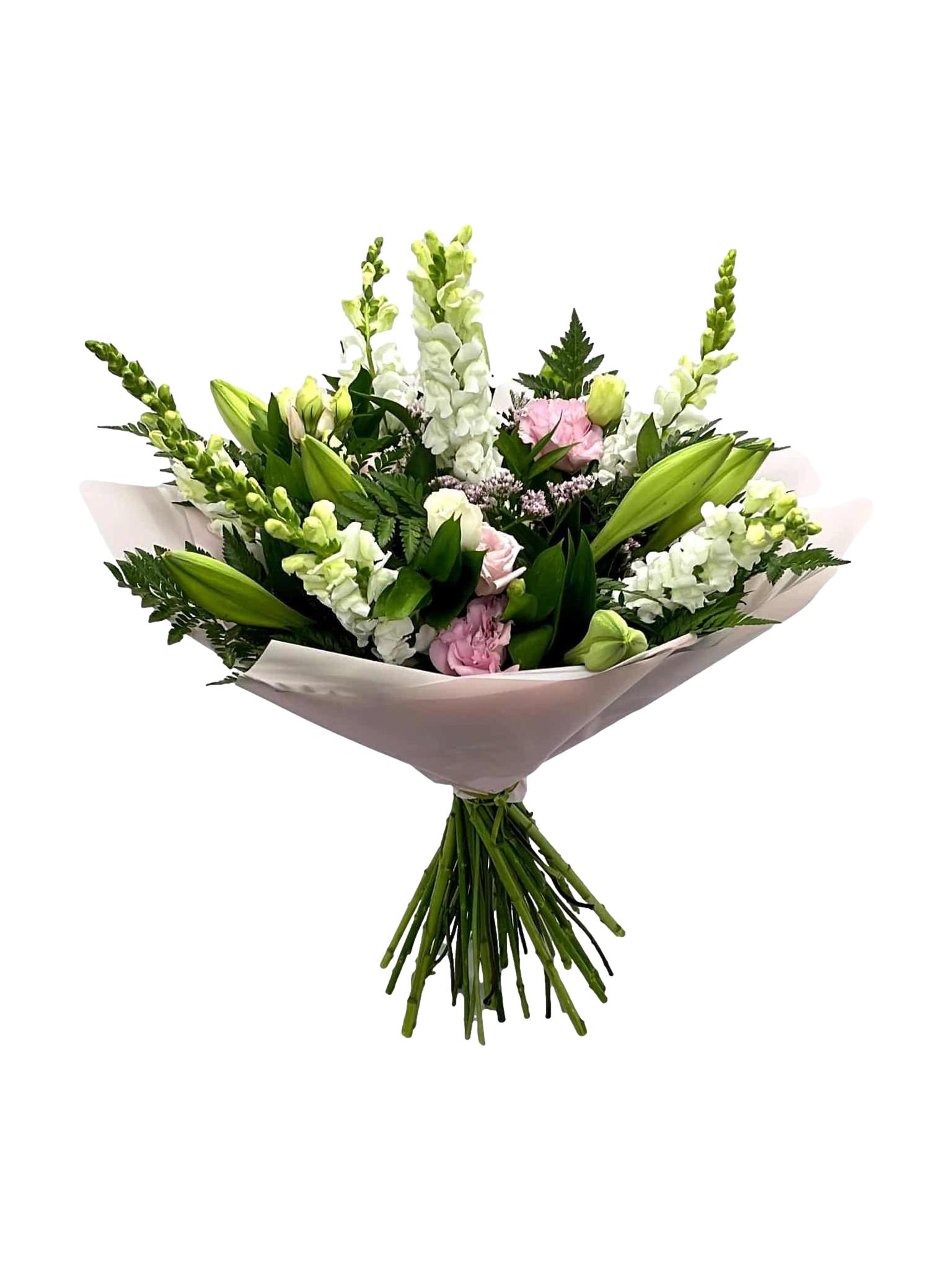 זר מורכב מ שושן צחור , לוע הארי לבן וליזינטוס/ או אלסטרומריה צבע הפרחים לפי המלאי בחנות