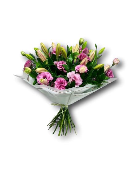 זר עליז מורכב מ ליליות וליזיינטוס ורוד (צבע הפרחים לפי המלאי בחנות )