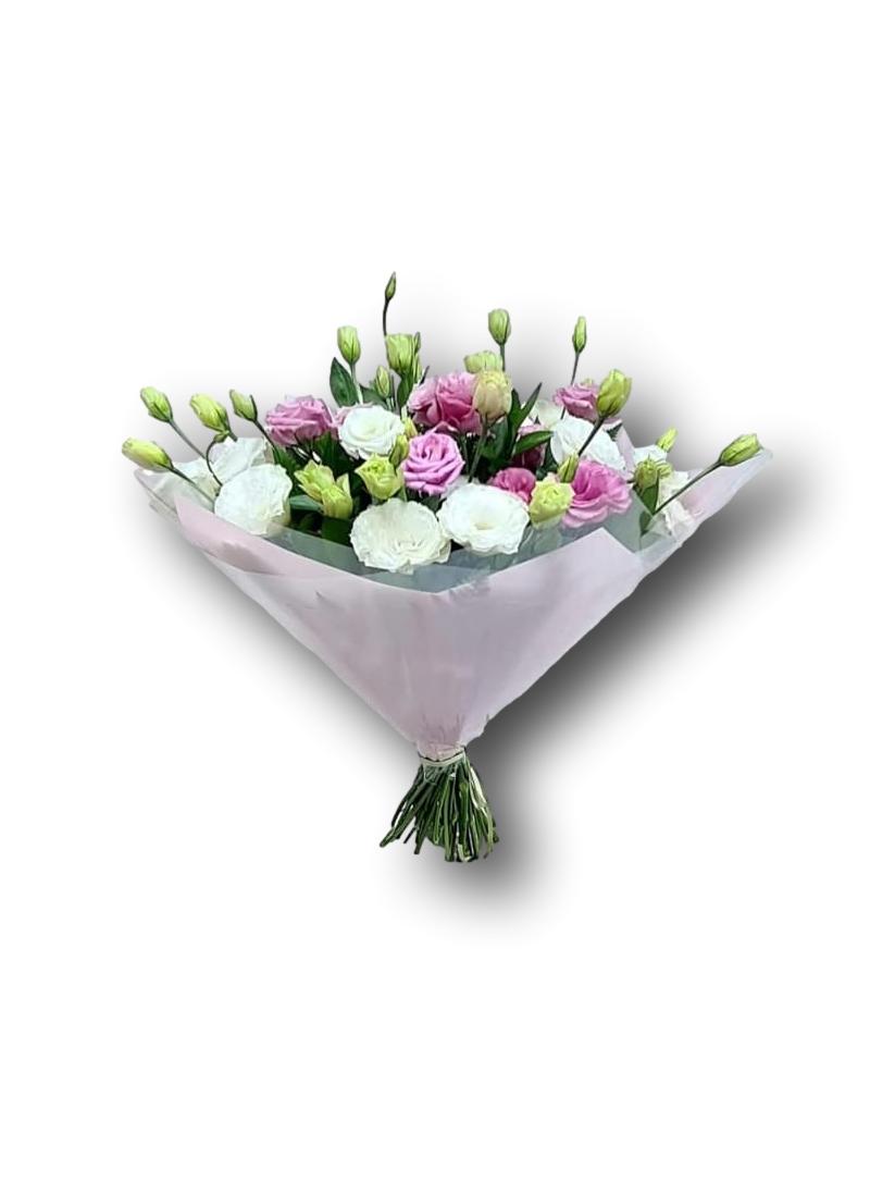 זר רך מורכבים מפרחים עדינים מאוד ליזיינטוס לבן + ורוד ( צבע הפרחים לפי המלאי בחנות