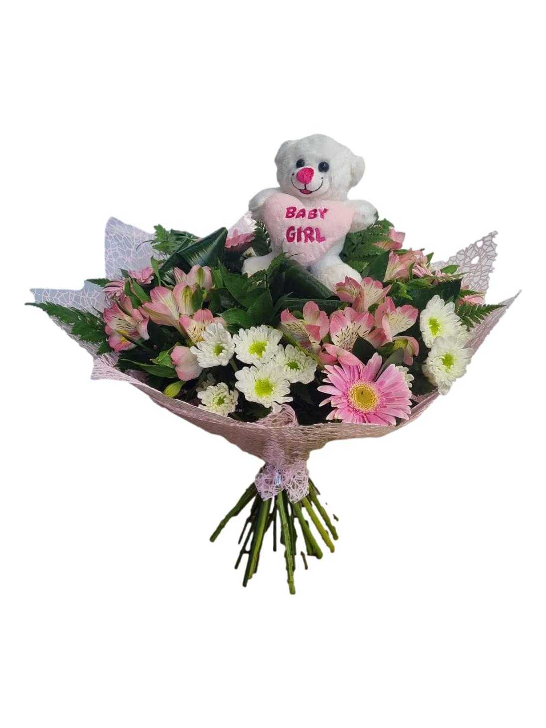 זר פרחים לבן ורוד מפרחי עונה עם דובי ליולדת
