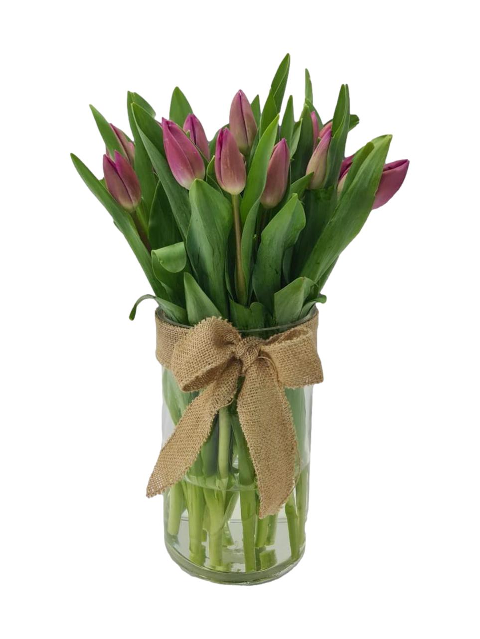 זר מורכב מ- 19 טוליפים בתוך אגרטל זכוכית מיוחד עם סרט יפה