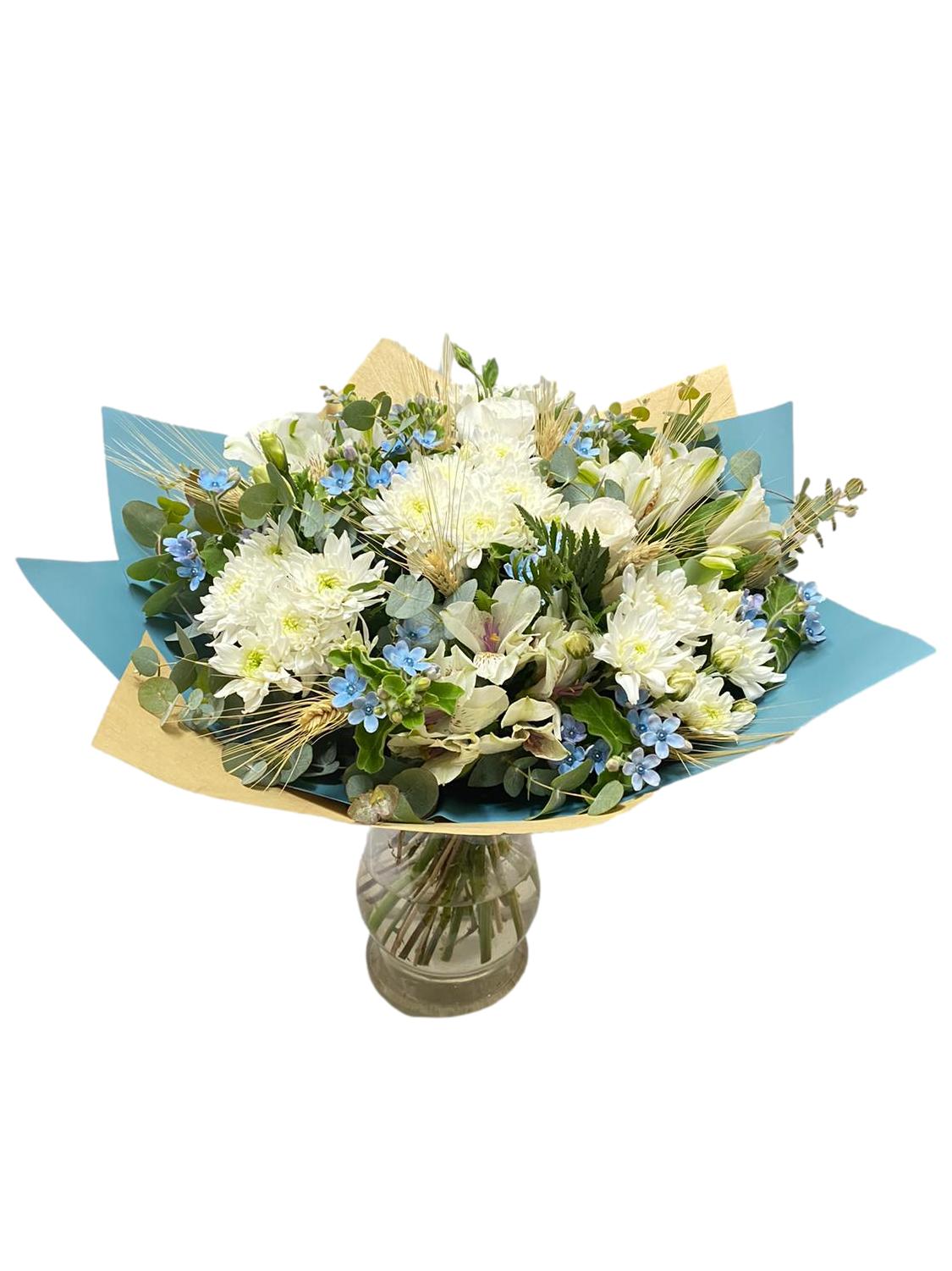 זר עדין מאוד לבן ותכלת עם שיבולית מורכב מ חרציות אלסטרומריה לבנה , ליזיינטוס לבן וטווידה תכלת עטיפה מיוחדת