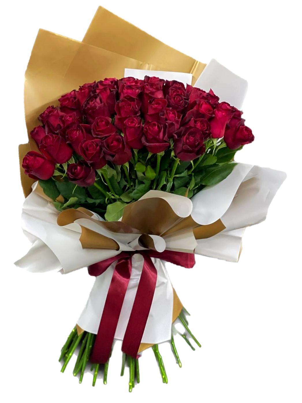 זר ורדים מורכב מ 45 ורדים בורדו עם עטיפה יפה מיוחדת