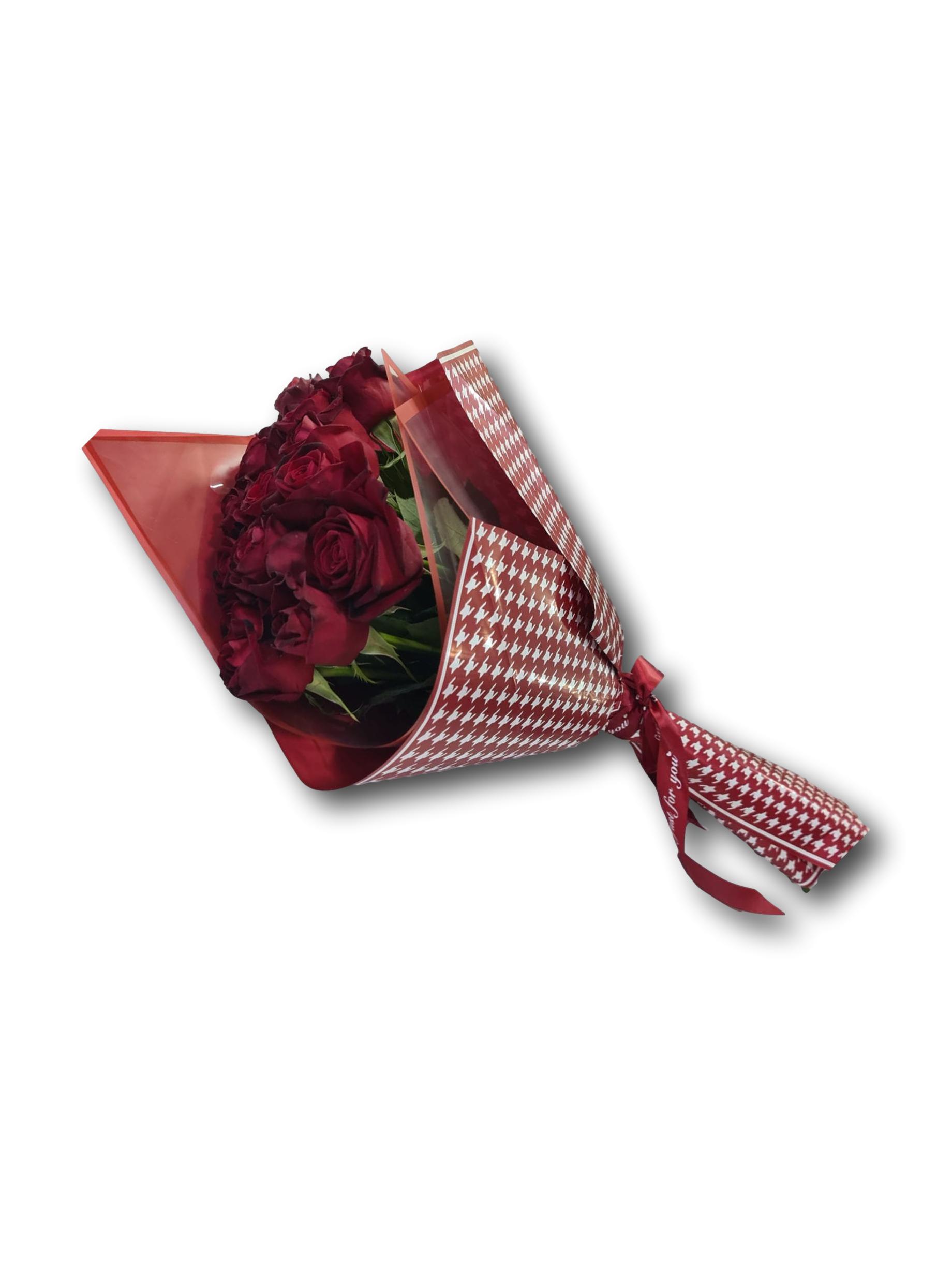 זר הגשה מורכב מ- 15 ורדים בורדו עם עטיפה מיוחדת