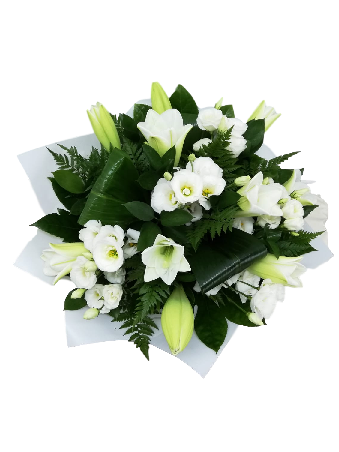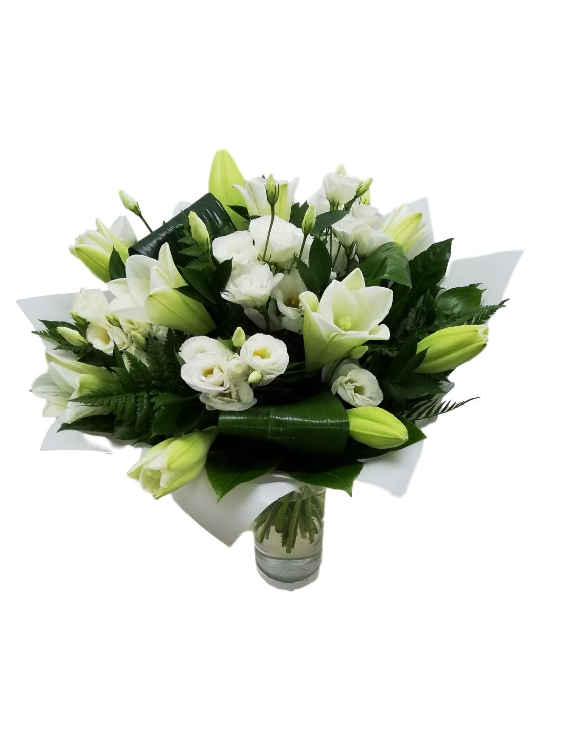זר מורכב מ שושן צחור וליזיינטוס לבן עם ירק מיוחד