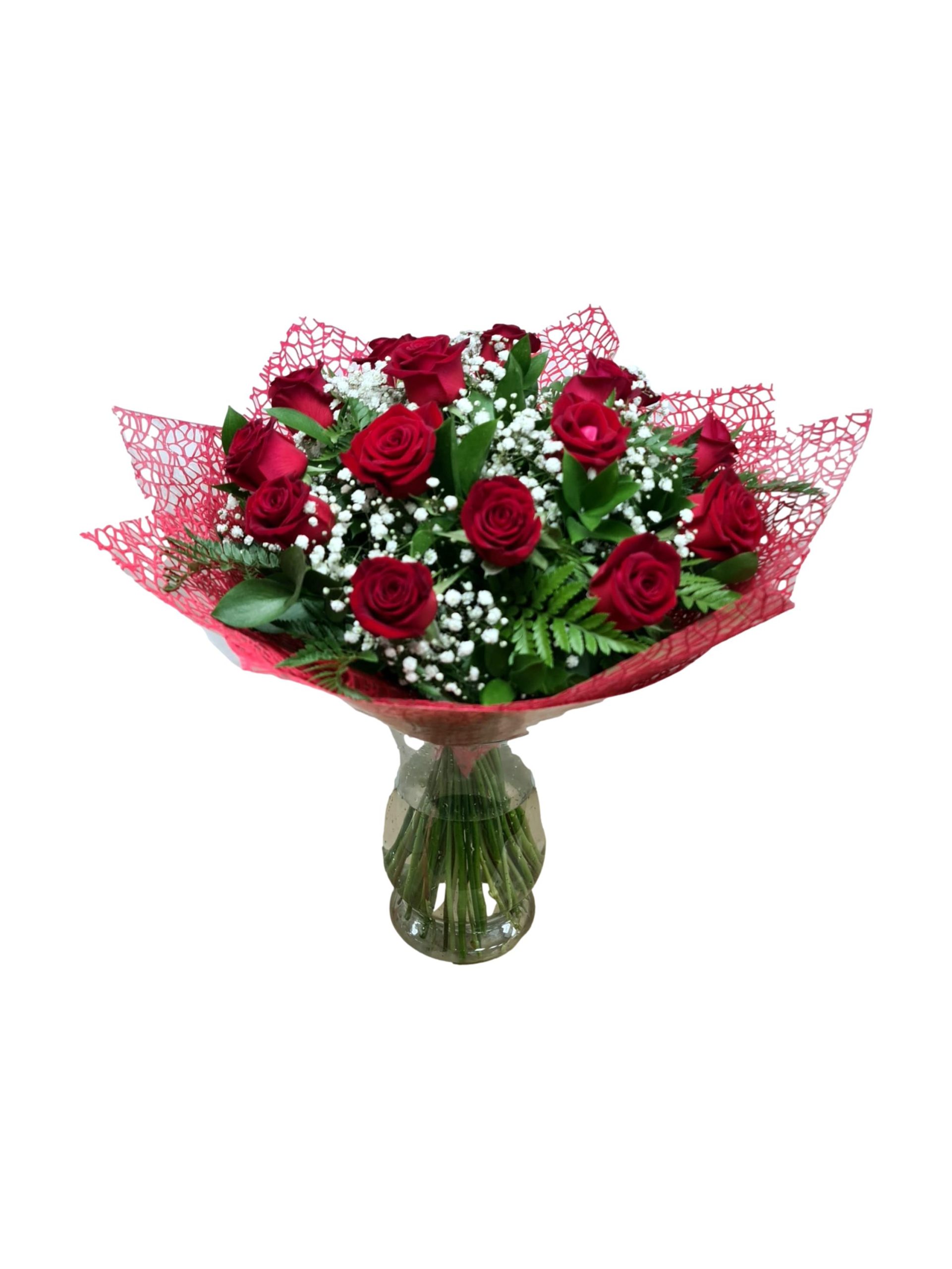 זר ורדים מורכב מ- 15 ורדים בורדו עם גיפסנית יפה