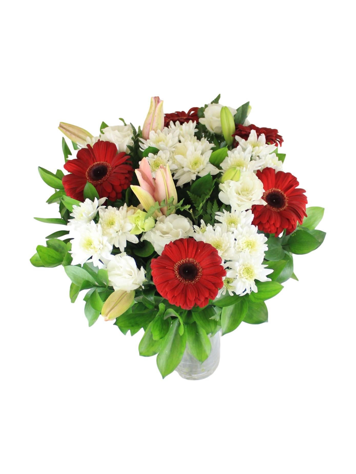 זר ליטוף של אהבה מורכב מ ליליות, שושן צחור, אלסטרומריה וחרציות צבע הפרחים לפי המלאי בחנות
