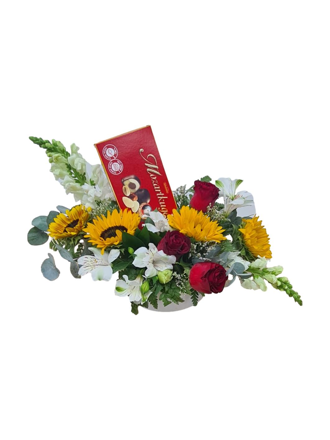 סידור כפרי בכלי זכוכית מיוחד עם שלל פרחים כפרים מפרחי עונה עם שוקולד מוצרט
