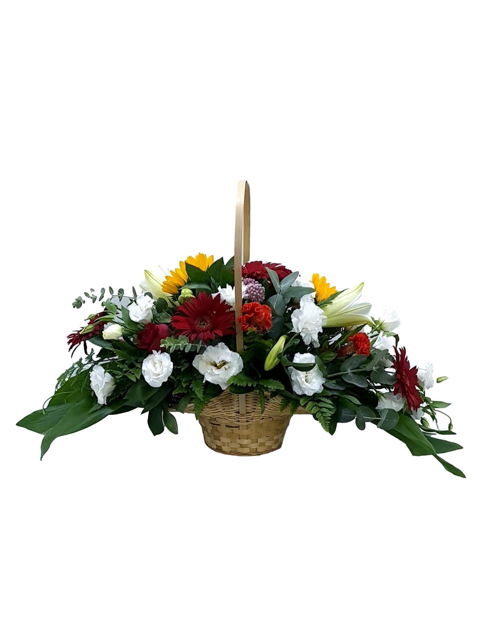 סלסלת קש מורכבת מ חמניות , גרברות אדום ורדים אדום ליזיינטוס לבן שושן צחור ( סוגי הפרחים לפי המלא בחנות )