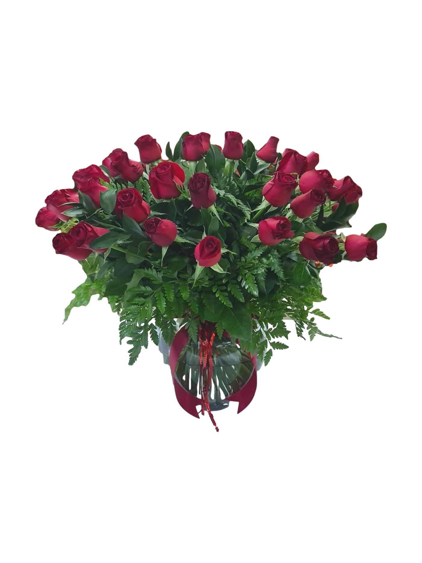 זר ורדים קלאסי ומרשים סמל לאהבה מורכב מ-45 ורדים בורדו עם אגרטל