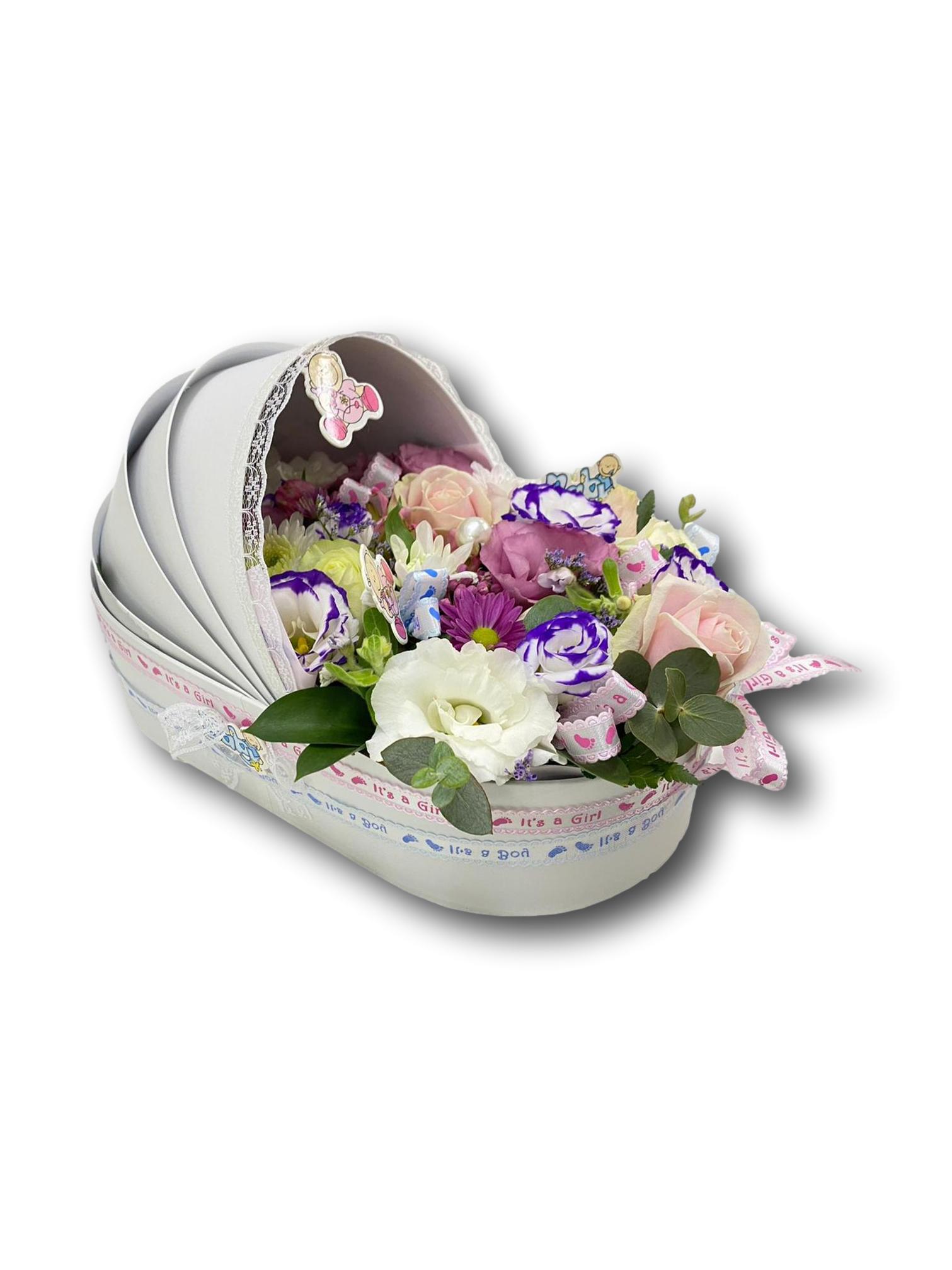 שלל פרחים בתוך מארז של מיטת תינוק מיוחד מאוד אישי מתאים ליולדת בן או בת