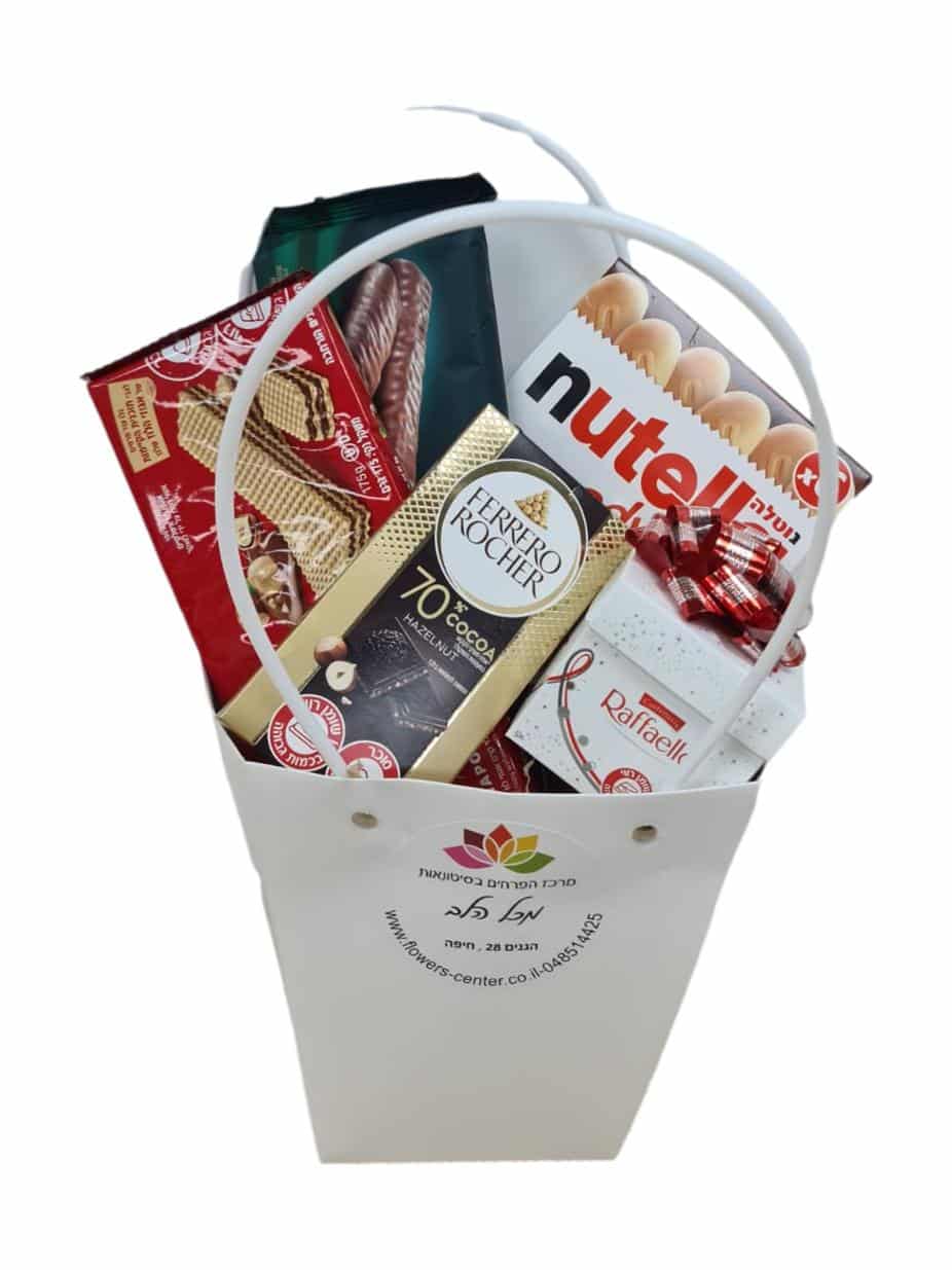 סלסלת ממתקים מתנה אישית בסלסלת קרטון עם שתי ידיות שיש בה מבחר של שוקולדים, נוטלה בי רדי ,קובית רפאלו, 1 וופלים לוקר, וופל רבע לשבע, ושוקולד פיררו מומלץ מאוד