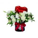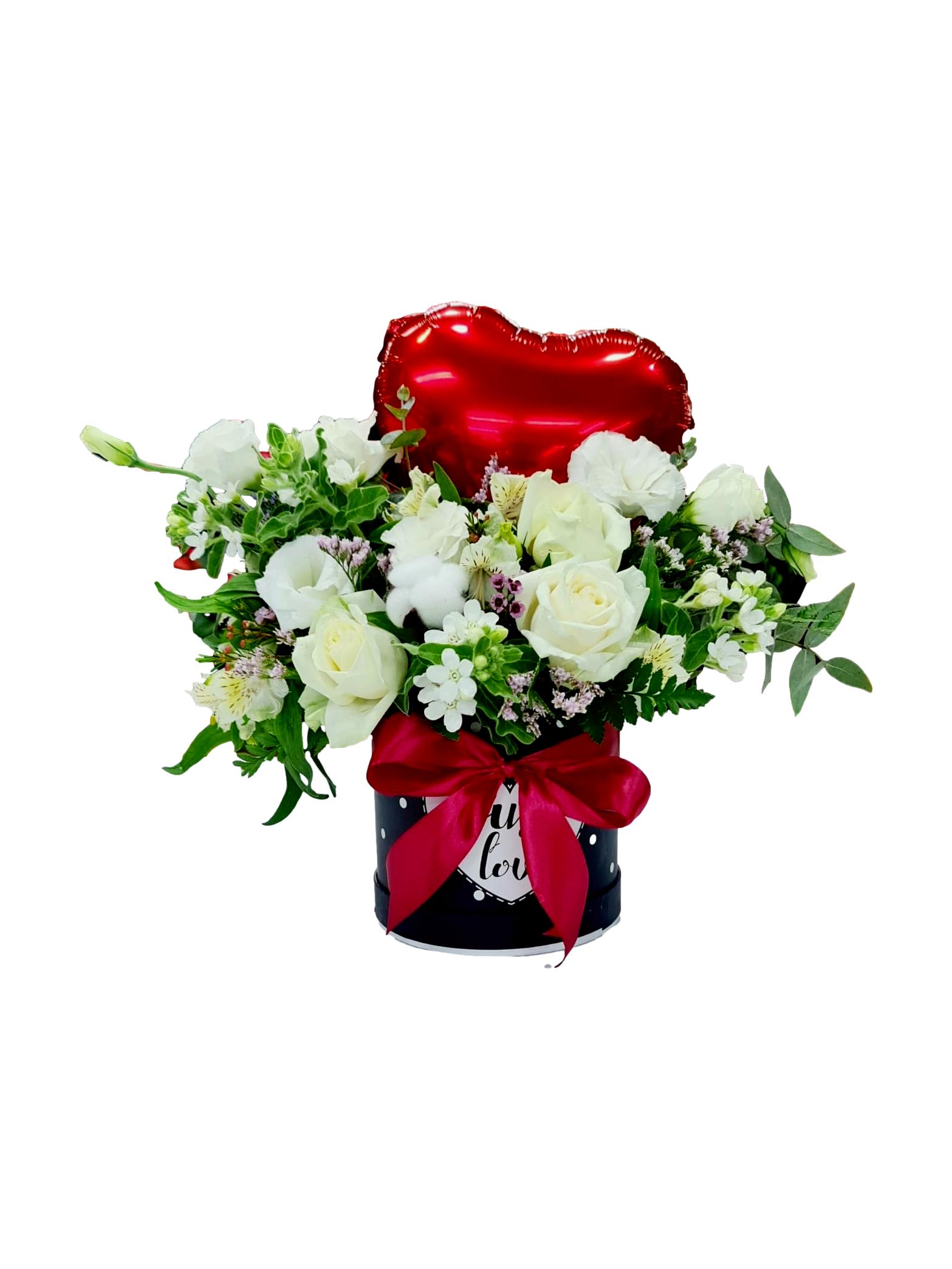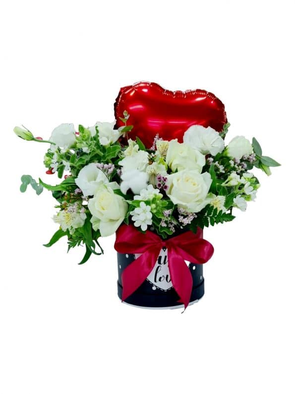 קופסא שחורה עם בלון לב אדום עם פרחי עונה בלבן