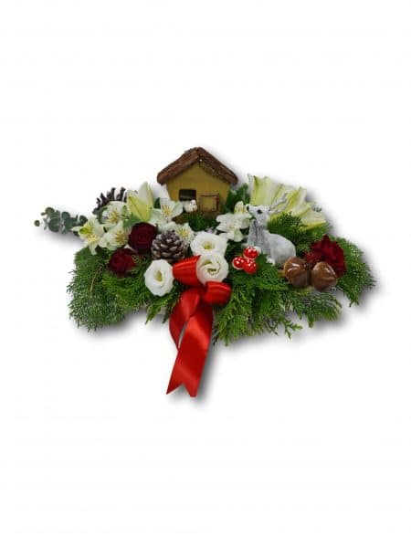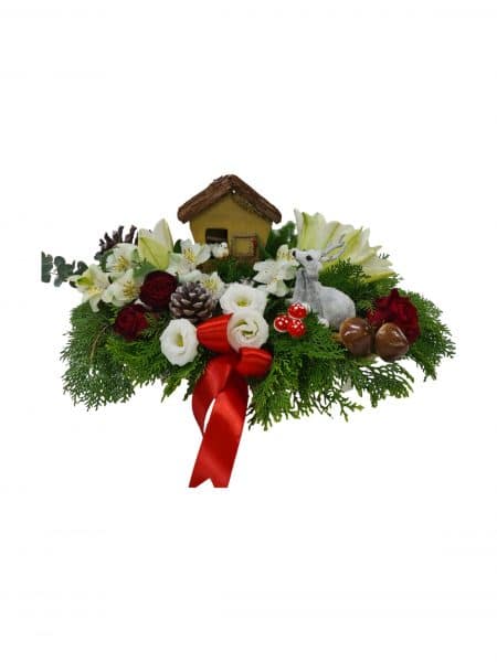 סידור חורפי קסום בסלסלה המשלב פרחים בגווני לבן ואדום, ירק עשיר ואלמנטים טבעיים מהיער