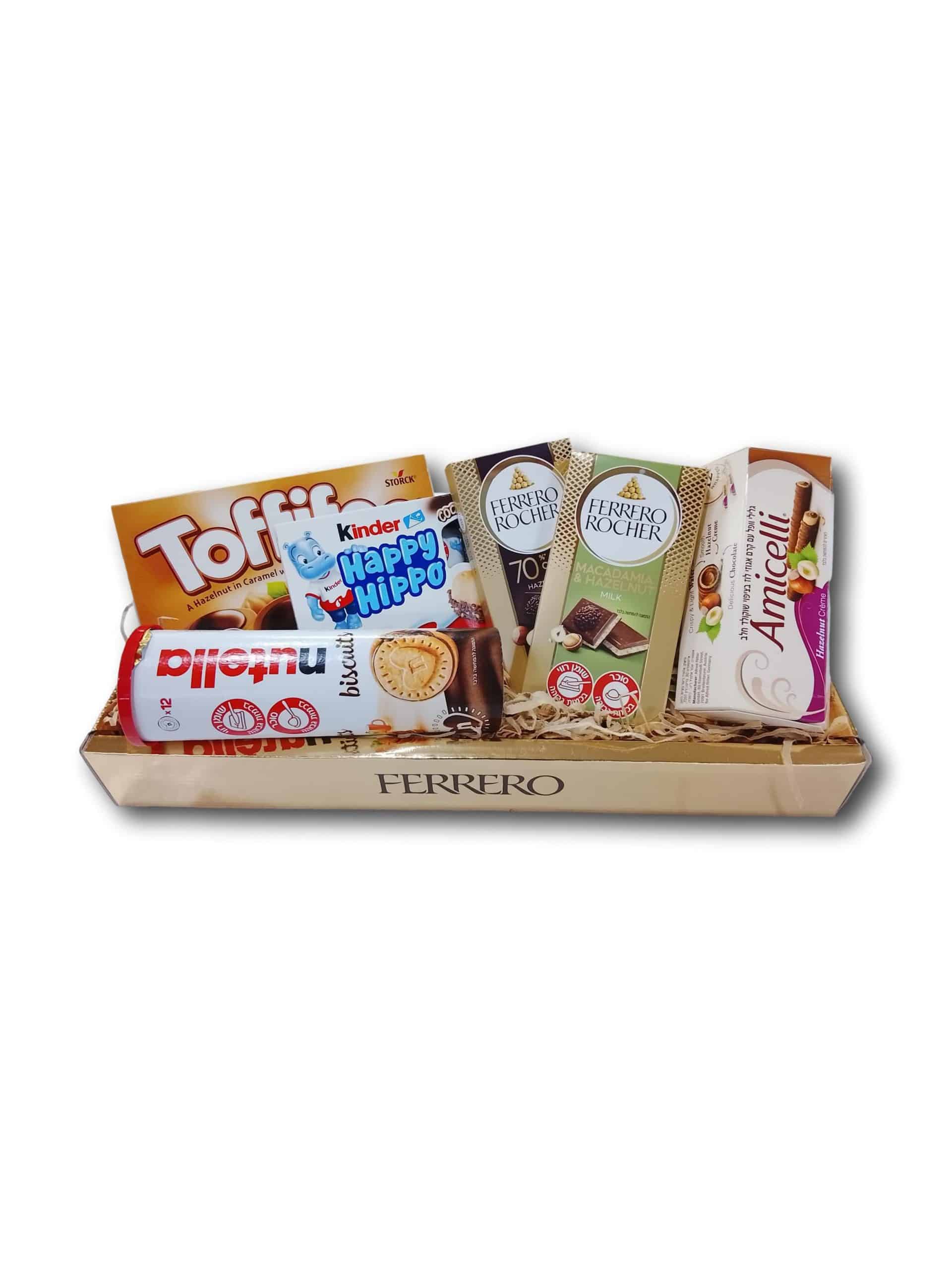 מארז מתוקה שלי מארז של שוקולדים , חבילתסוכריות טופי עם אגוזי לוז ,חבילת HAPPY HIPPO, חבילת גלילי וופל עם קרם אגוזי לוז ,קופסאת ביסקוויטים במילוי נוטלה , קופסאת כדורי וופל פריך מצופה בשוקולד חלב פררו רושה , שוקולד מריר מעלוה פררו רושה , שוקולד חלב עם שברי אגוזי לוז פררו רושה