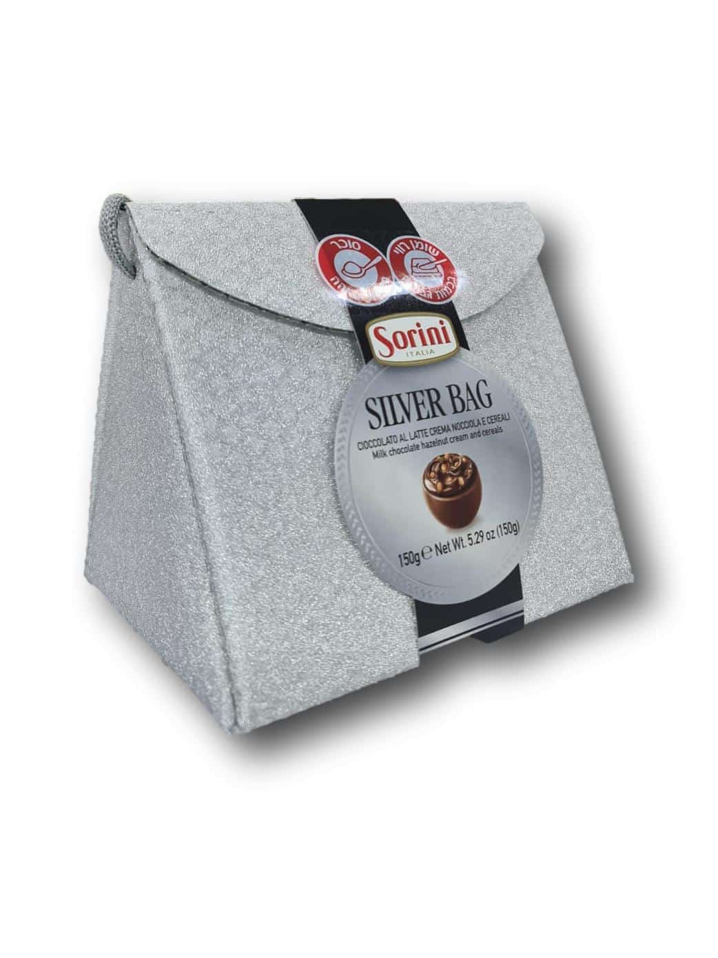 תיק שוקולד חלב ממולא קרם אגוזי לוז 53% כשר לפסח צבע התיק לפי המלאי כסף או זהב