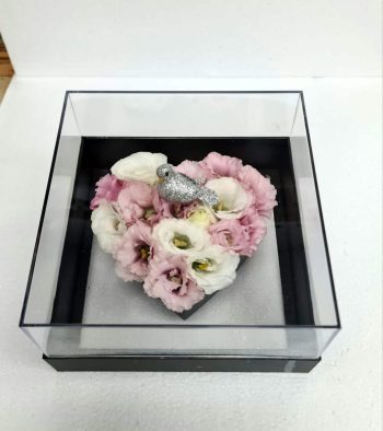קופסאת פרחים שזורה בחמניות ליליות ורדים אסטרומריה ופרח כותנה ( פרחי עונה ) במידה וחסר בעונה פרח מסיום פרח חלופי במקום